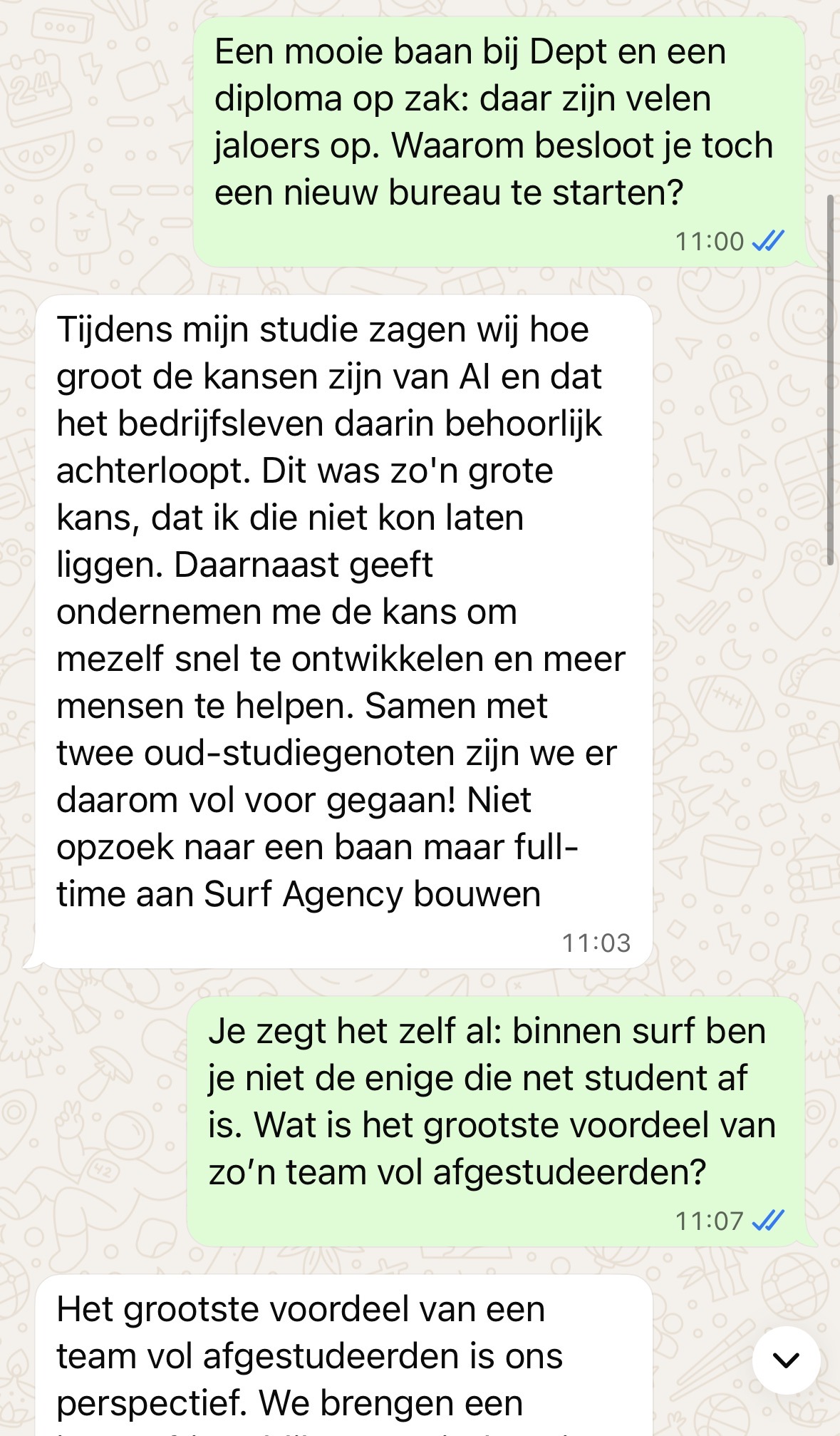 Tijdens mijn studie zagen wij hoe groot de kansen zijn van AI en dat het bedrijfsleven daarin behoorlijk achterloopt. Dit was zo'n grote kans, dat ik die niet kon laten liggen. Daarnaast geeft ondernemen me de kans om mezelf snel te ontwikkelen en meer mensen te helpen. Samen met twee oud-studiegenoten zijn we er daarom vol voor gegaan! Niet opzoek naar een baan maar full-time aan Surf Agency bouwen.
