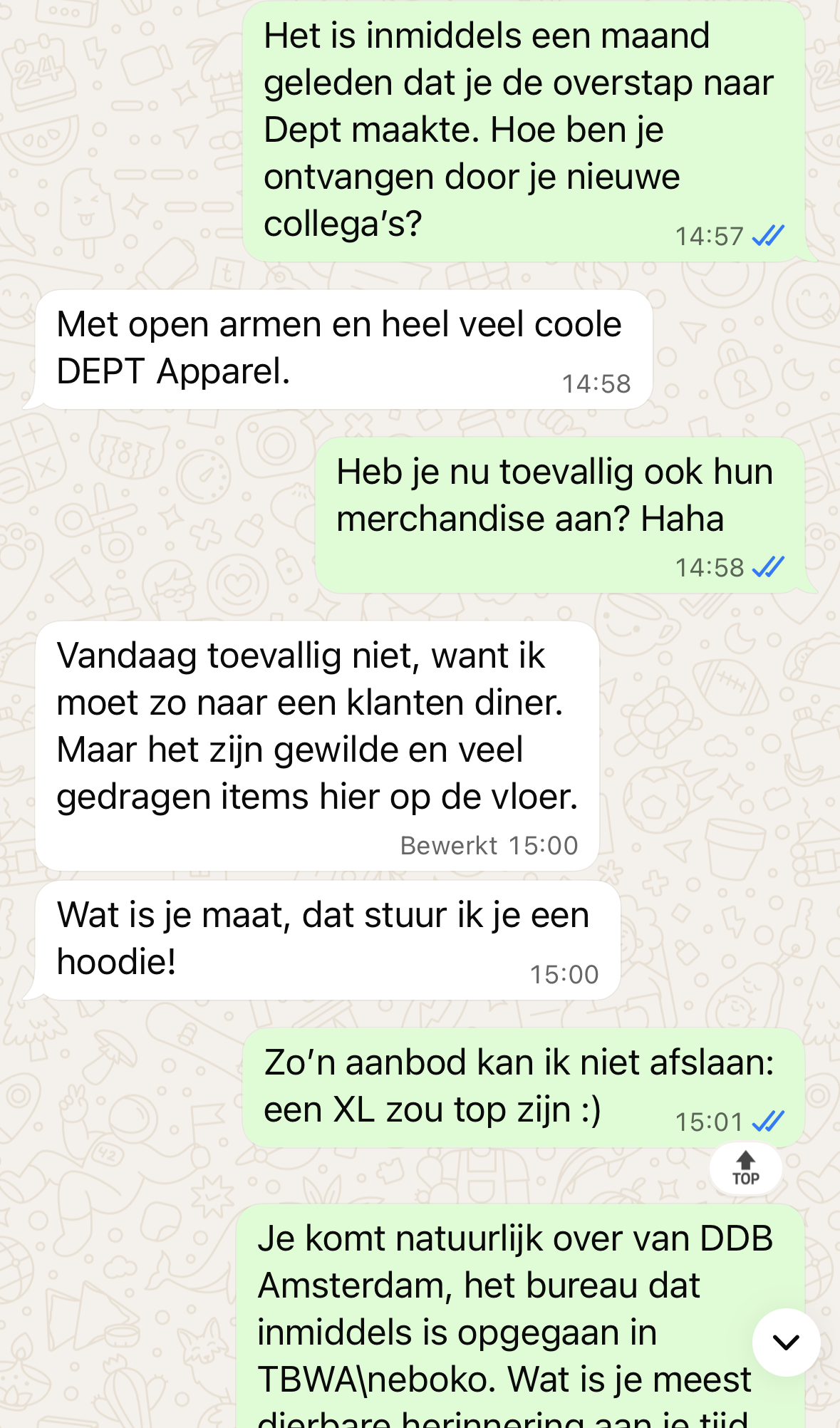 Zo’n aanbod kan ik niet afslaan: een XL zou top zijn :) Je komt natuurlijk over van DDB Amsterdam, het bureau dat inmiddels is opgegaan in TBWA\Neboko. Wat is je meest dierbare herinnering aan je tijd daar?