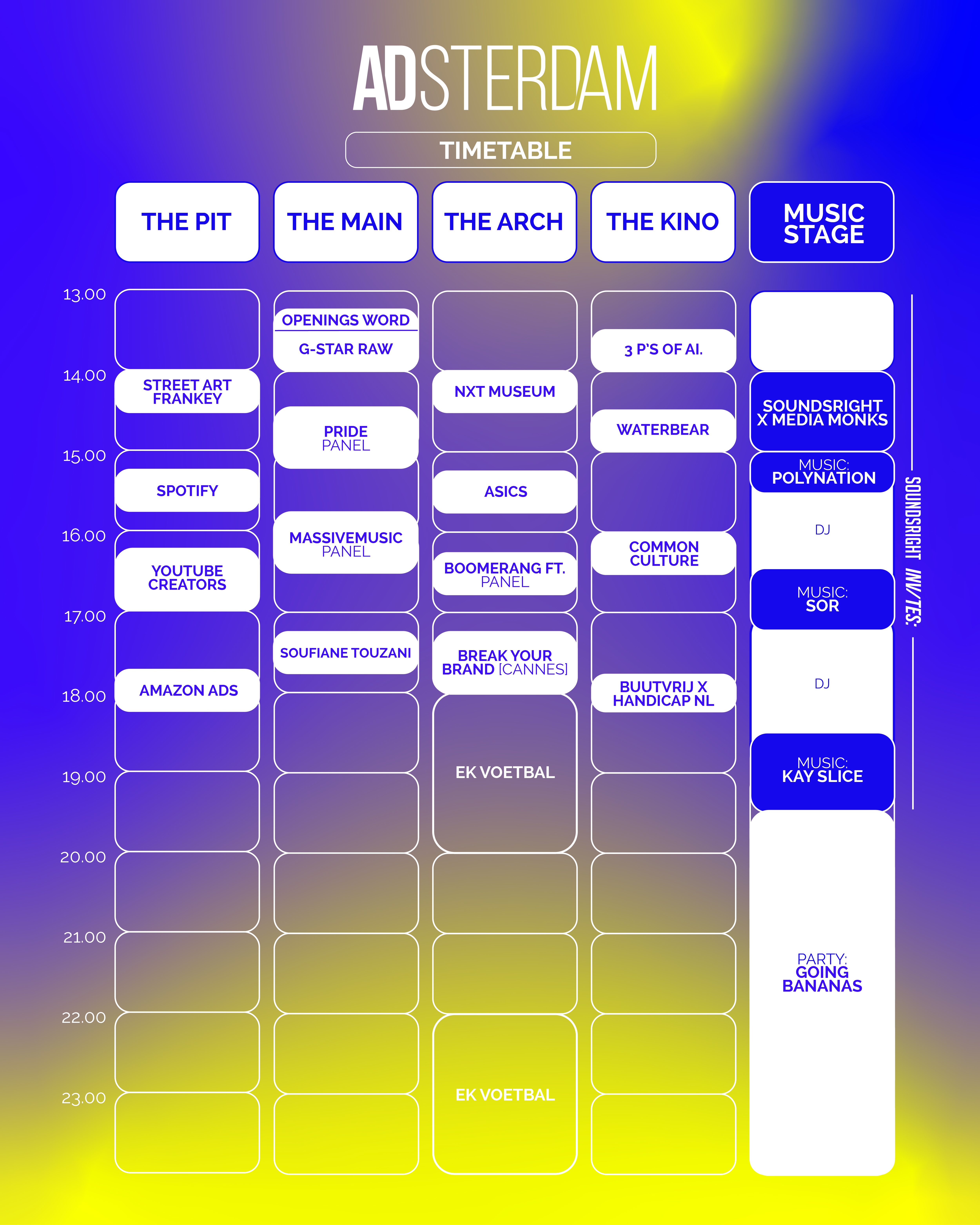 Ook het volledige blokkenschema is inmiddels bekend, zie onderstaand. De organisatie verwacht dat je als bezoeker een goede route kunt maken tussen kunst, muziek, (new) media, inclusiviteit, sport, netwerken en de dag kan eindigen met een festivalwaardig feest, georganiseerd door de makers van Milkshake Festival: Going Bananas.