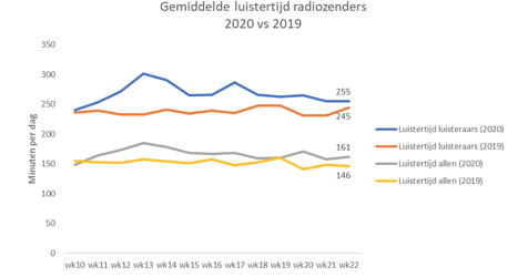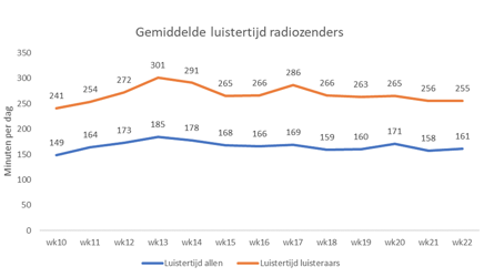 Nederlanders van 10 jaar en ouder luisterden in week 22 gemiddeld 161 minuten per dag naar de radio. Onder radioluisteraars ligt het gemiddelde op 255 minuten per dag. Beide niveaus zijn respectievelijk 10 procent en 4 procent hoger dan in dezelfde periode een jaar geleden. Het weekbereik blijft stabiel, vergelijkbaar met 2019. De gezamenlijke radiozenders haalden een bereik van 85 procent, dat is gelijk aan het niveau van week 21.