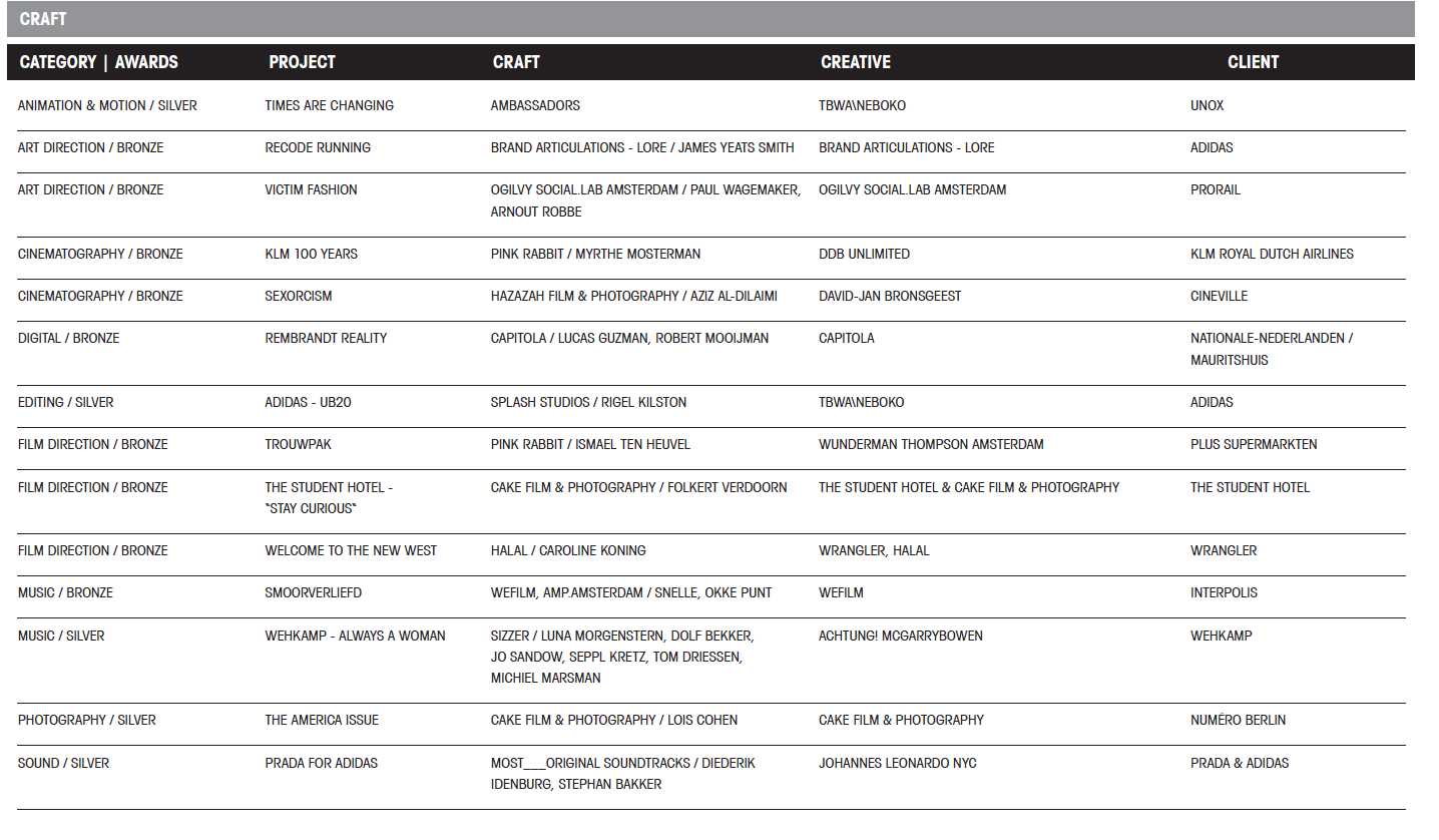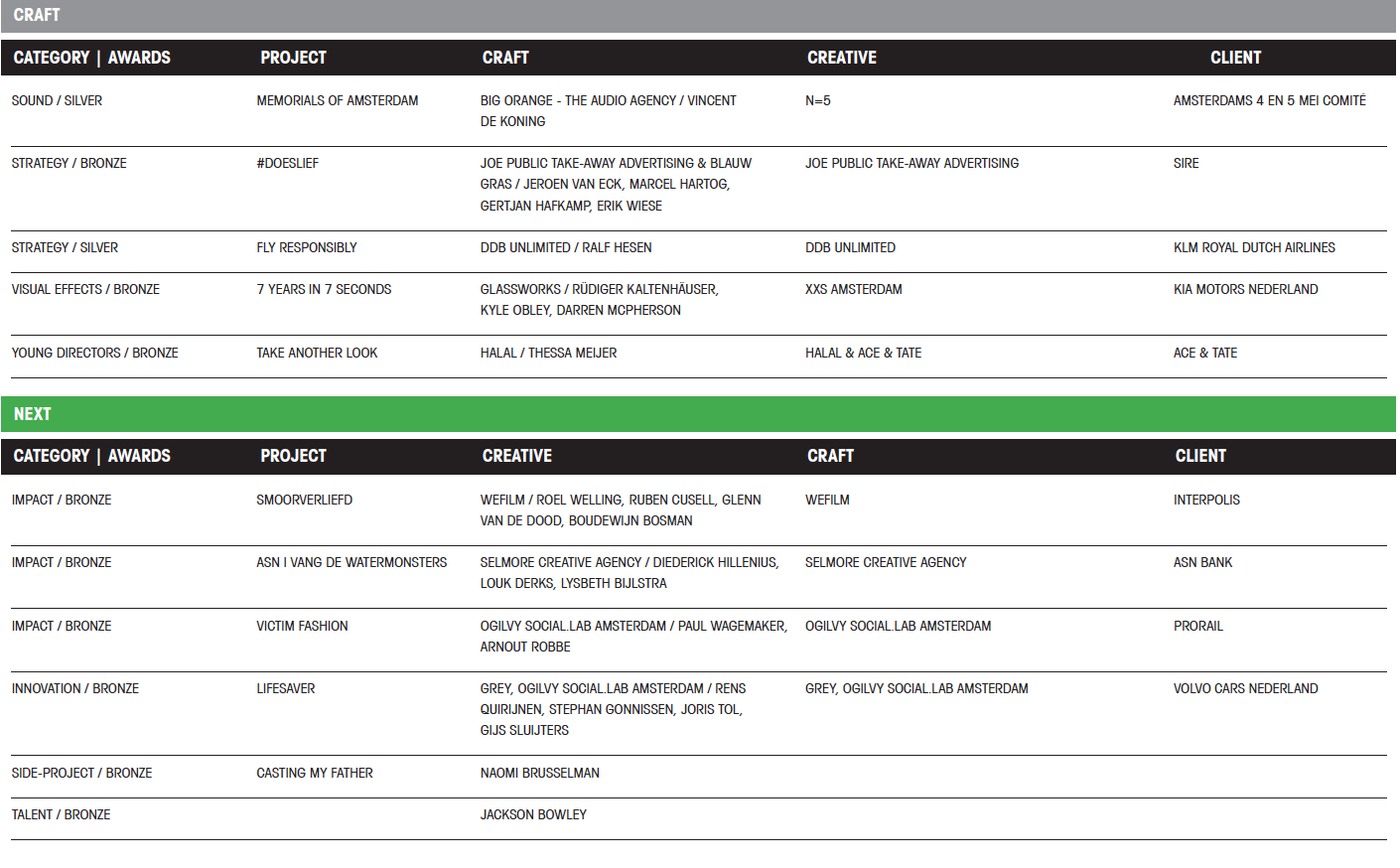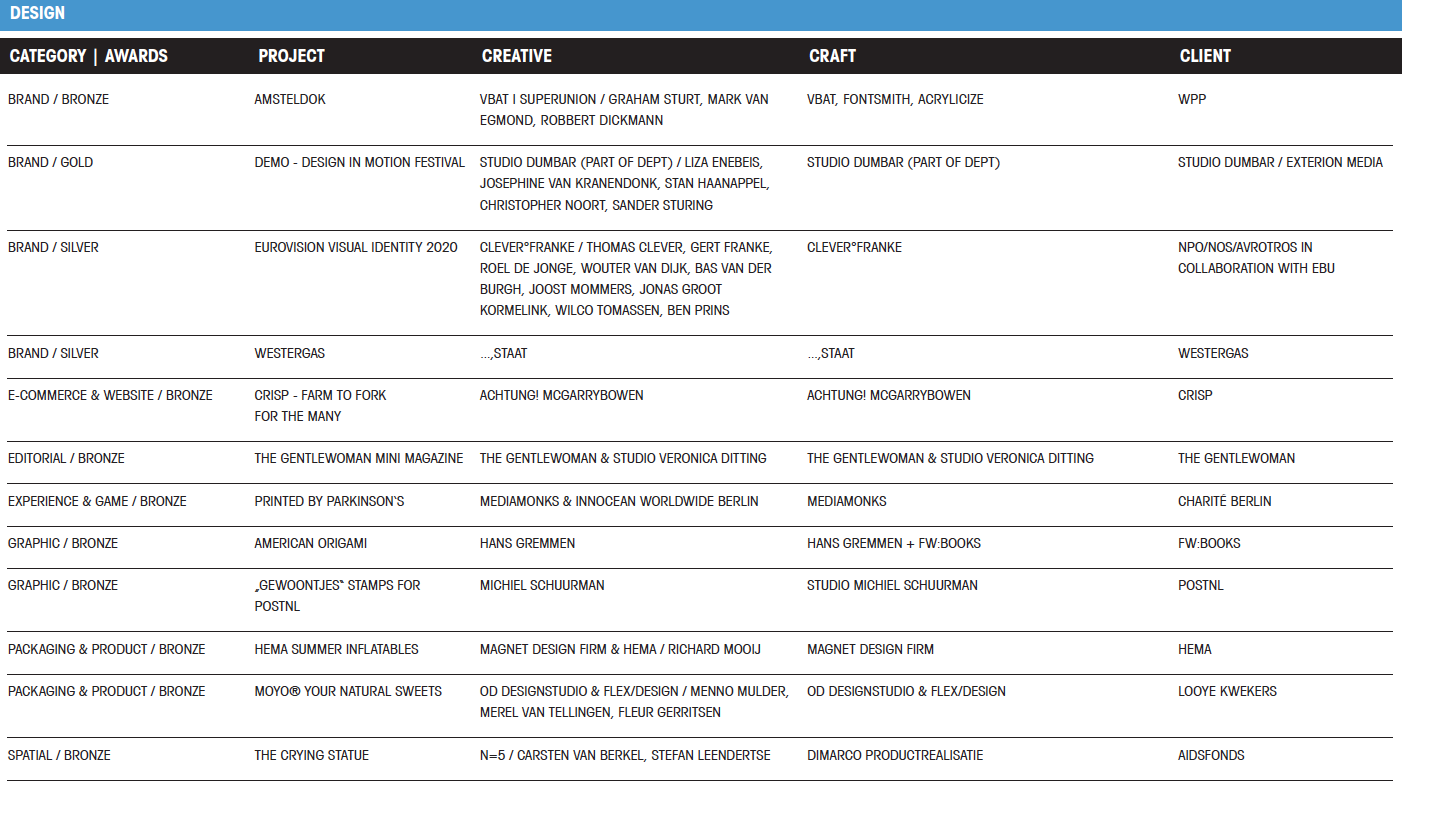 19 in Craft and 6 in Next. Er waren 2 gouden Lampen, 11 zilveren Lampen en 39 bronzen Lampen (naast de ADCN Members Award en Grand Prix). Veel Lampen gingen dit jaar naar projecten waar bedrijven en instanties met hun merken en creativiteit samenwerken aan maatschappelijke vraagstukken.Studio Dumbar en Exterion Media wonnen een gouden Lamp – in Design – met DEMO, het motion design festival waar creatief talent van over de hele wereld hun werk gedurende 24 uur heeft tentoongesteld op de digitale schermen van het Centraal Station in Amsterdam.