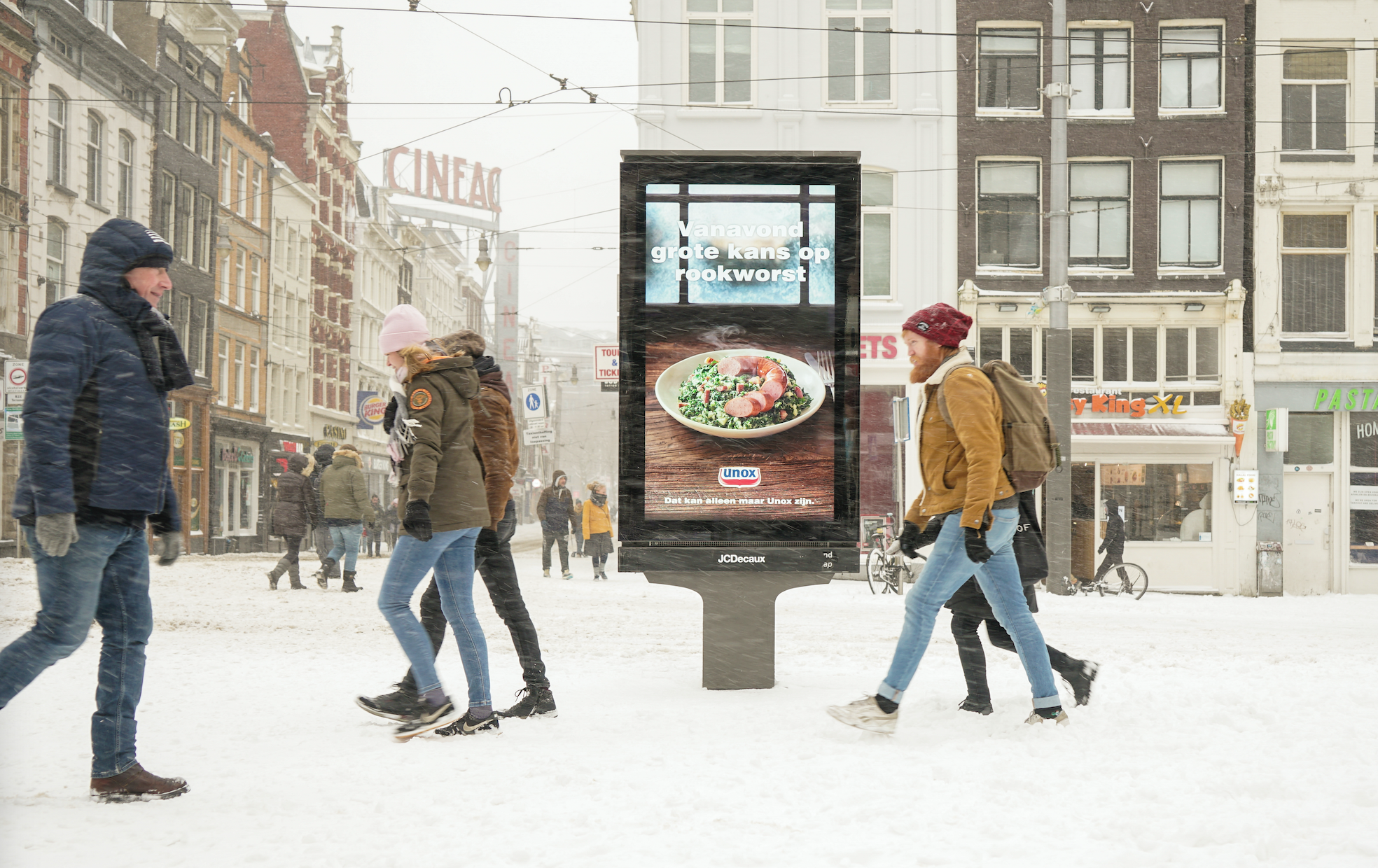 Afgelopen dagen speelden Unox, Heineken en Jägermeister in op de actuele weersomstandigheden. Op zaterdagavond werd de content aangeleverd bij JCDecaux en vervolgens razendsnel geactiveerd op de displays op straat. Door middel van Digital Out of Home werd de content al snel trending topic in de fysieke wereld.