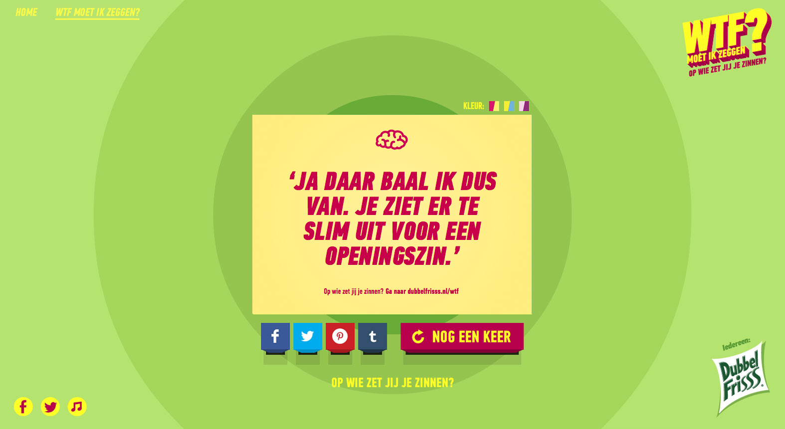 DubbelFrisss heeft de dienst, WTF moet ik zeggen, gelanceerd om jongeren te helpen face to face te praten. Steeds vaker vinden gesprekken plaats via een beeldscherm, 80% van de jongeren spendeert ruim 15 uur per week aan social media. Hierbij durven jongeren vaak meer te zeggen dan in een face to face gesprek.