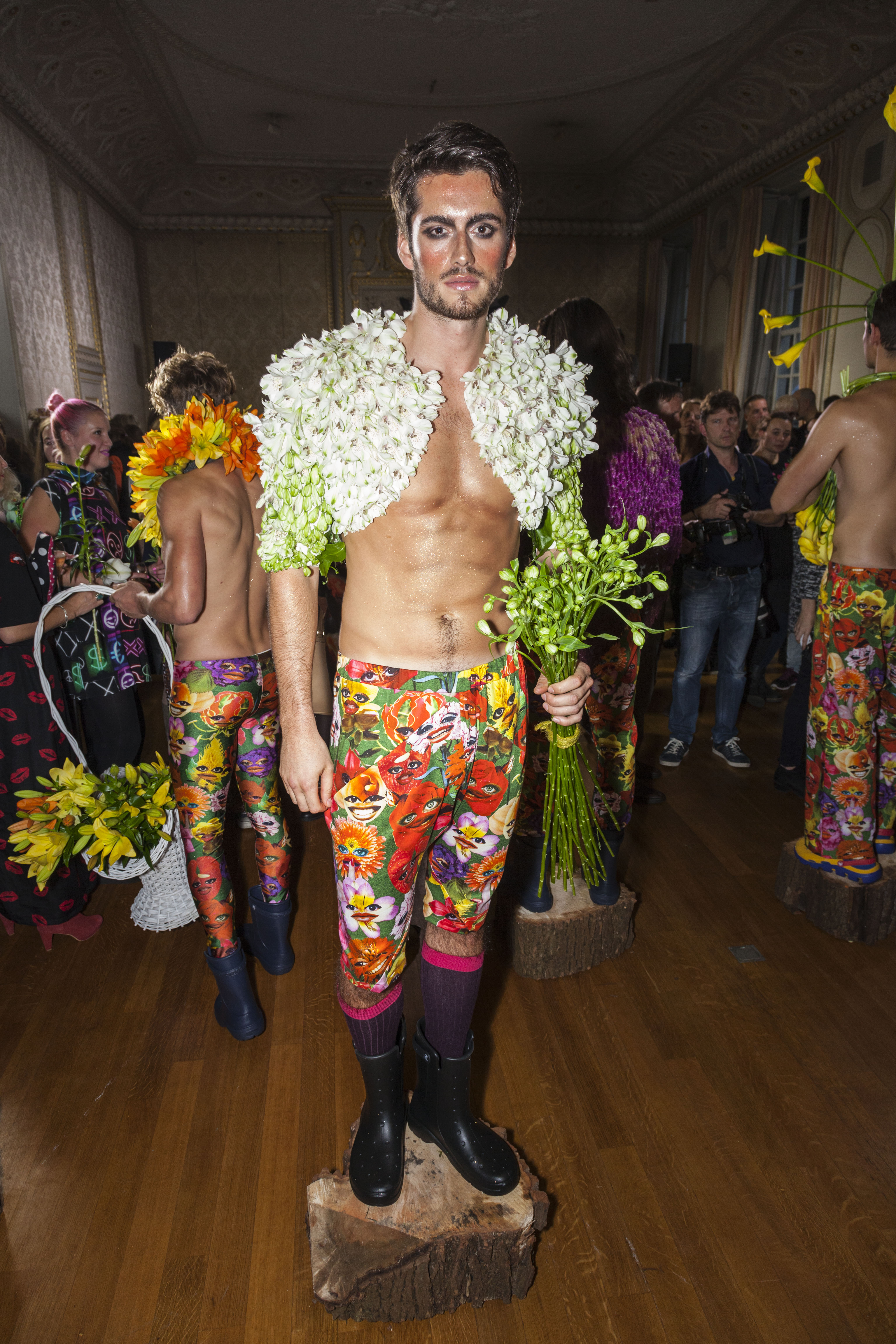 De catwalk was een lange grasstrook die het publiek omsloot, alle modellen eindigden op een boomstam/sokkel en vormden tezamen een schitterend slotbeeld als levende kunstinstallatie. Het publiek werd uitgenodigd om de mannen van dichtbij te bekijken en bloemen voor elkaar te plukken.