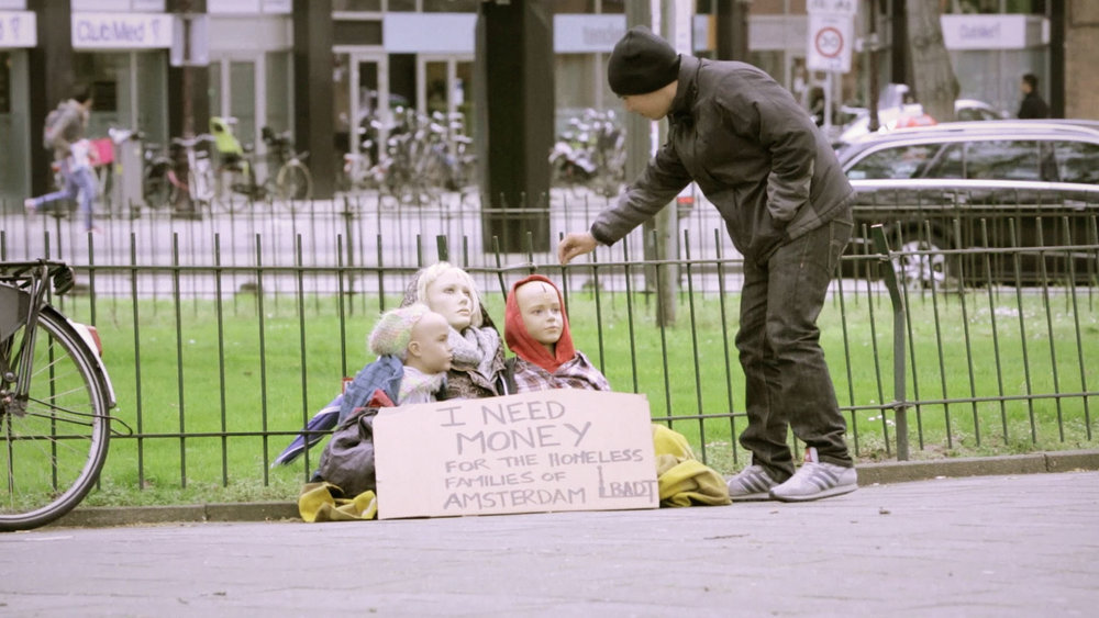 Het concept is simpel: om meer mensen van de straat te halen, zetten we meer daklozen op straat. De uitvoer: etalagepoppen aankleden in afgetrapte, gebruikte kleding en zaag een grote gleuf in hun voorhoofd, zoals je die ook in een spaarpot ziet. Resultaat: een online video waarin etalagepoppen, verspreid door Amsterdam, aangekleed zijn als dakloze met een handgeschreven kartonnen bordje waarop een donatie voor de Belangenbehartiging Amsterdamse Dak- en Thuislozen (BADT) wordt gevraagd.