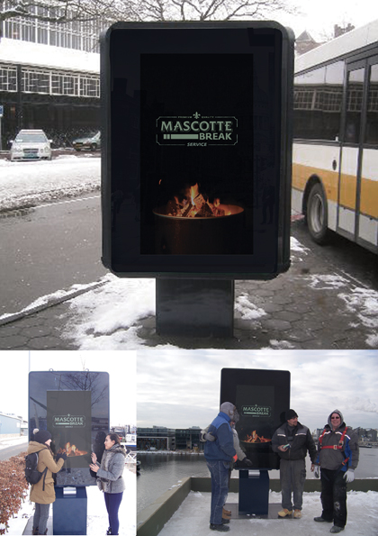 De eerste Mascotte Break Service draait om een interactieve abri die geactiveerd kan worden zodat het als een knisperend haardvuur, warmte afgeeft. Zo ontstaat een aangename warme plek om relaxed te genieten van je break.