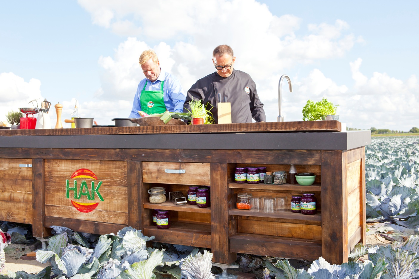 Koeman staat in zijn kenmerkende trainershouding op het veld. Nu echter met een kookschort voor en op een rodekoolveld ergens in Noord-Nederland. Hij wordt door de nieuwe vaste HAK-kok Steef Cuijpers aan een keukenblok gecoacht hoe hij lekker rode kool kan maken.