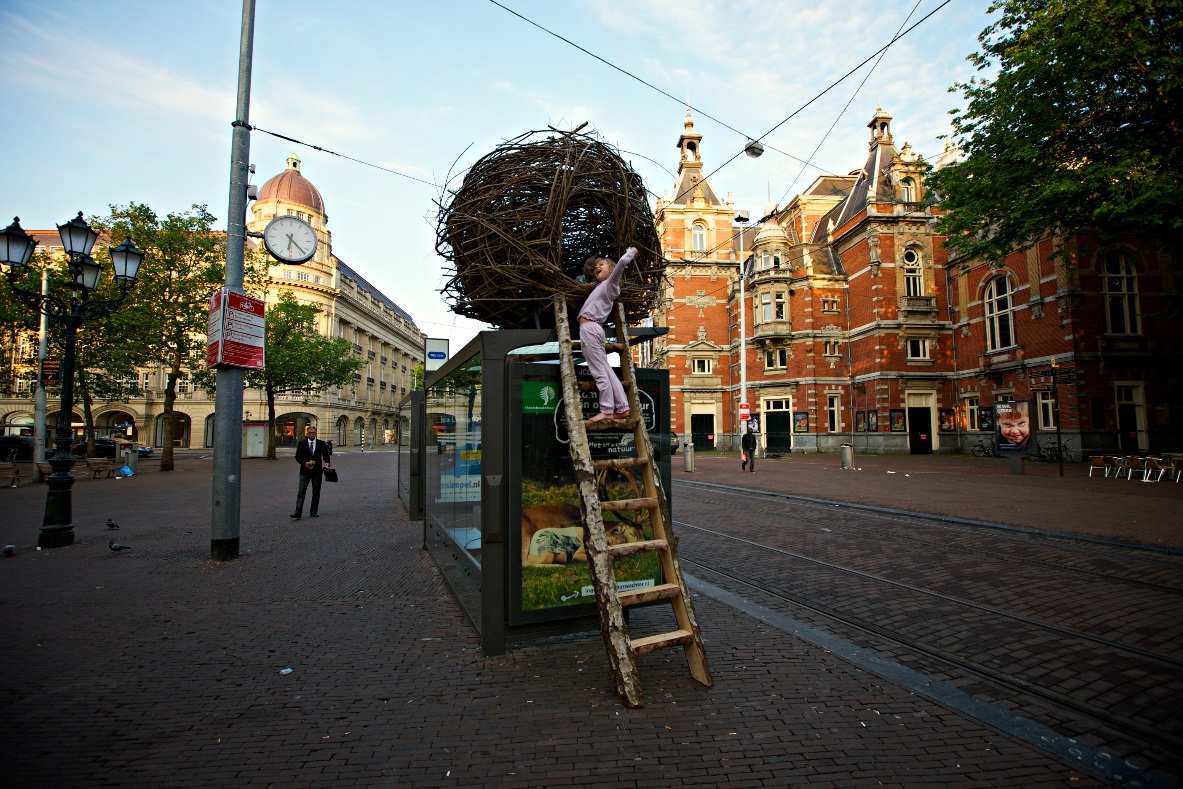 Staatsbosbeheer heeft gisteren voor één dag een levensgroot nest bovenop een tramhokje van het Leidseplein in Amsterdam geplaatst.