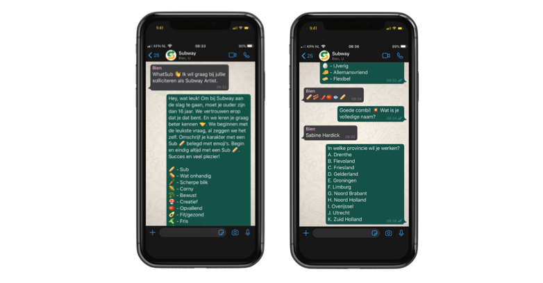 Je sollicitatie begint dus op WhatsApp. Met behulp van emoji’s in de vorm van een Sub (broodje) introduceer je jezelf bij Subway. Dit is direct je persoonlijke sollicitatie, want aan de hand van emoji’s laat je zien wat jouw karaktereigenschappen zijn. Zo staat de Spaanse peper voor pit, het eitje voor ijverig en de wortel voor een scherpe blik. Elke week krijgen de franchise owners de gegevens van de sollicitanten die specifiek bij hun restaurant gesolliciteerd hebben.