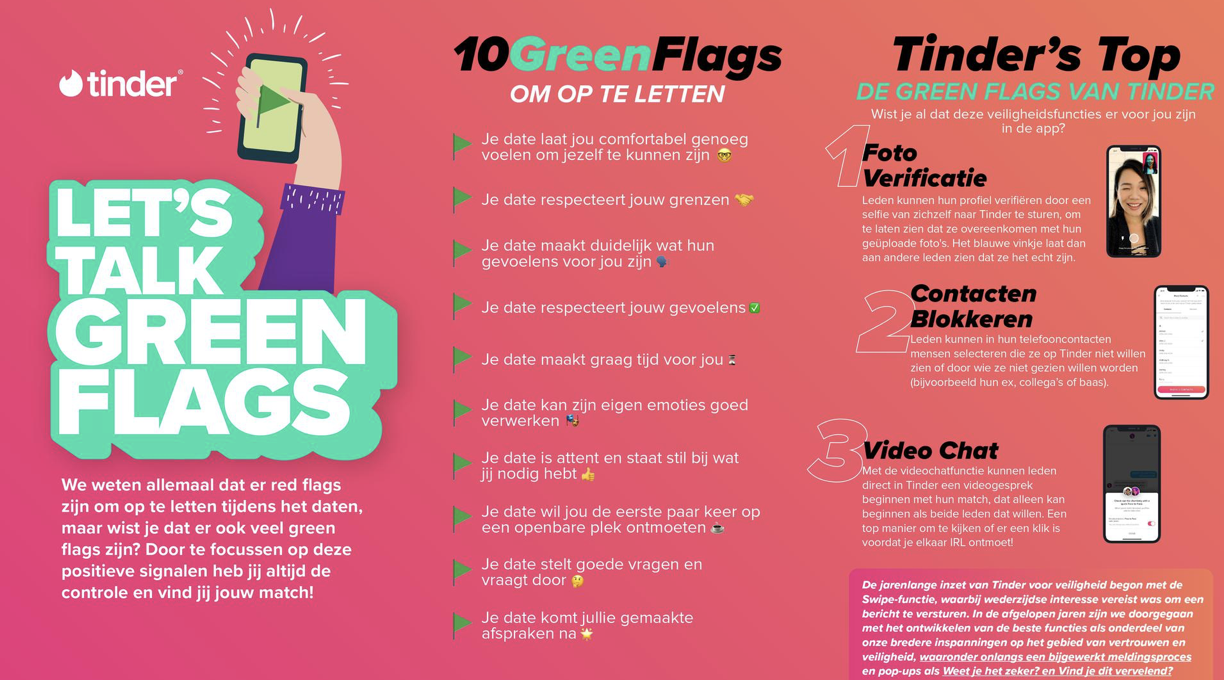 De veiligheidscampagne in Nederland, genaamd Green Flags Only, wijst op de veiligheidsfuncties die Tinder ter beschikking heeft om leden te verifiëren, te rapporteren, te blokkeren of van tevoren via een digitaal videogesprek te ontmoeten, zonder dat er persoonlijke gegevensuitwisseling aan te pas komt. Meestal wordt jongeren verteld wat ze niet moeten doen als ze online gaan daten - de red flags - maar in deze campagne draait Tinder het om. De campagne bestaat uit diverse social media uitingen en een onepager waar de veiligheidsfuncties ('green flags') op staan.