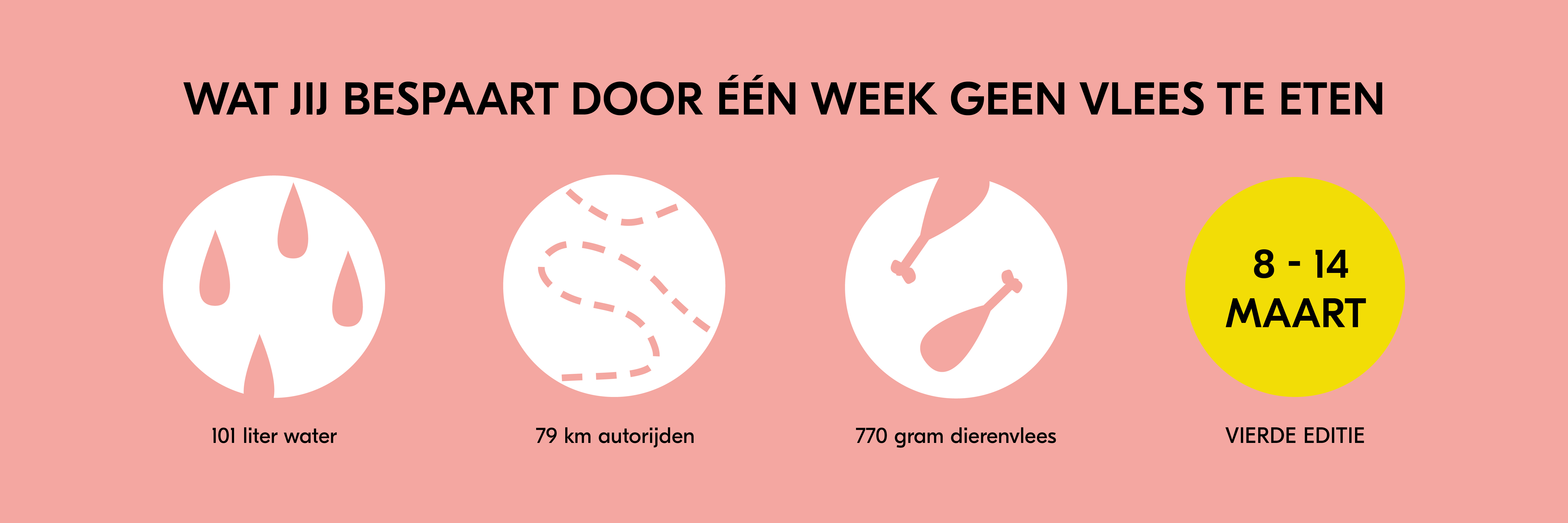 Wanneer je als volwassene een week geen vlees eet, bespaar je in zeven dagen 101 liter water, 79 km autorijden aan CO2-uitstoot en 770 gram dierenvlees (een halve kip). Deze besparingen zijn door middel van een ‘cradle to end of life’ levenscyclusanalyse doorgerekend door Blonk Consultants, rekening houdend met de nieuwste voedselconsumptiepeiling van het RIVM. Het volledige rapport is hier te vinden.