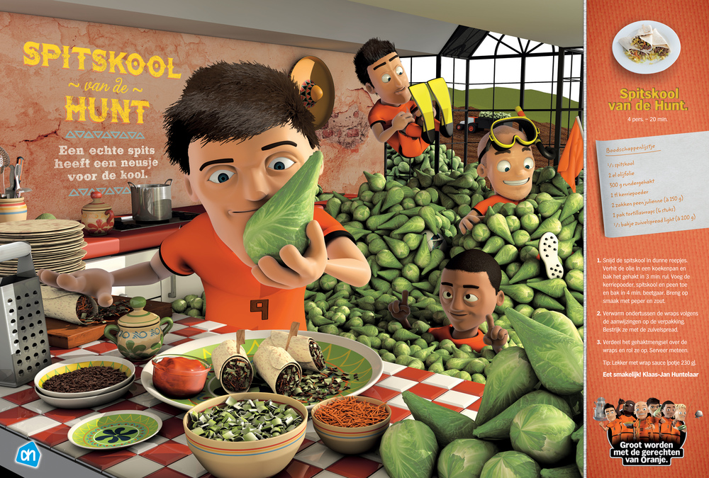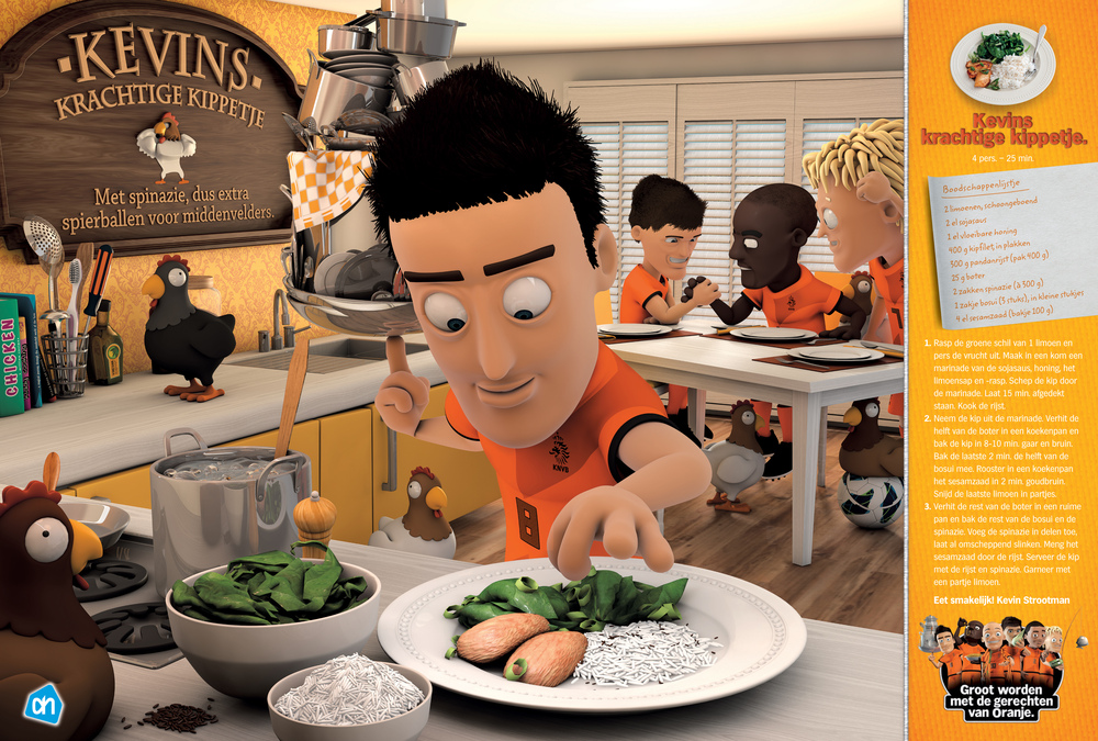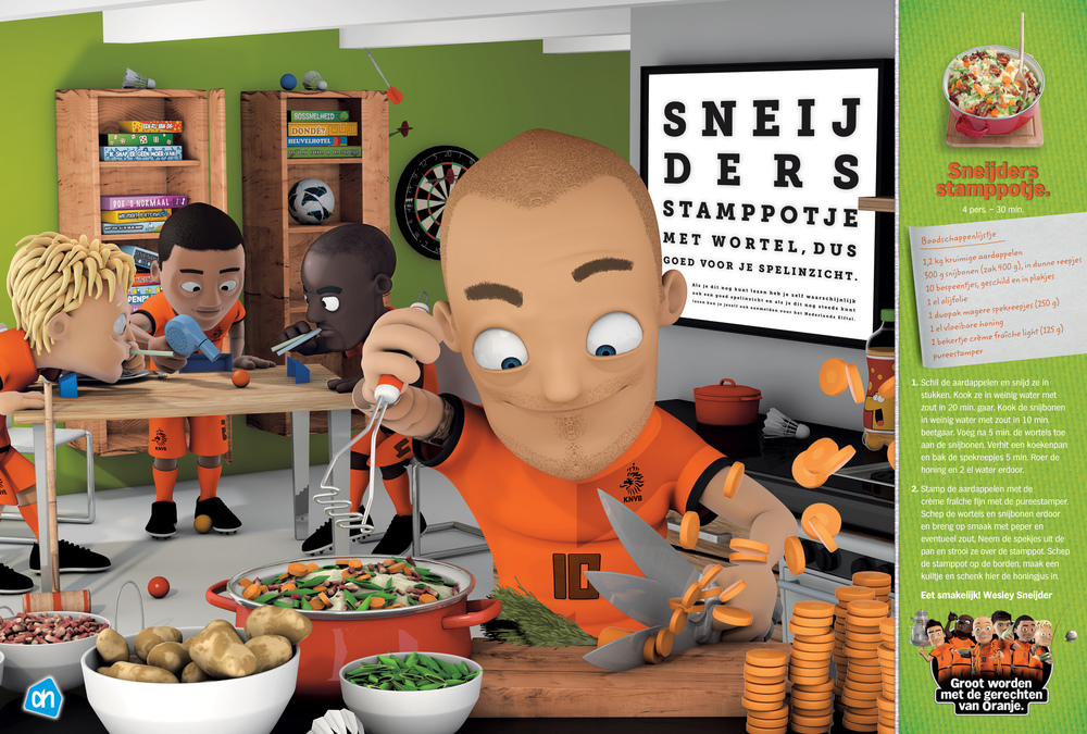 De recepten van de favoriete gerechten van zes Oranjespelers staan vanaf dinsdag 21 mei op placemats die gratis verkrijgbaar zijn in alle winkels van Albert Heijn. De supermarktketen helpt ouders op deze manier hun kinderen een goede en gevarieerde maaltijd voor te schotelen.