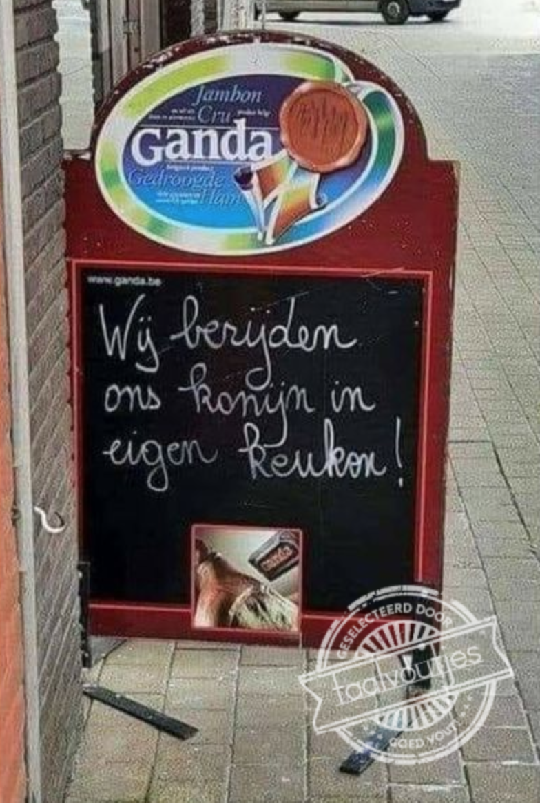 bekend. Maar konijnen?! Volgens een bord dat vorig jaar buiten een restaurant stond met de boodschap 'Wij berijden ons konijn in eigen keuken' is het echt mogelijk. De uitglijder kreeg maar liefst 19% van de stemmen in de jaarlijkse Taalvoutjes-verkiezing en mag dan de titel 'Taalvout van het jaar 2020' dragen.