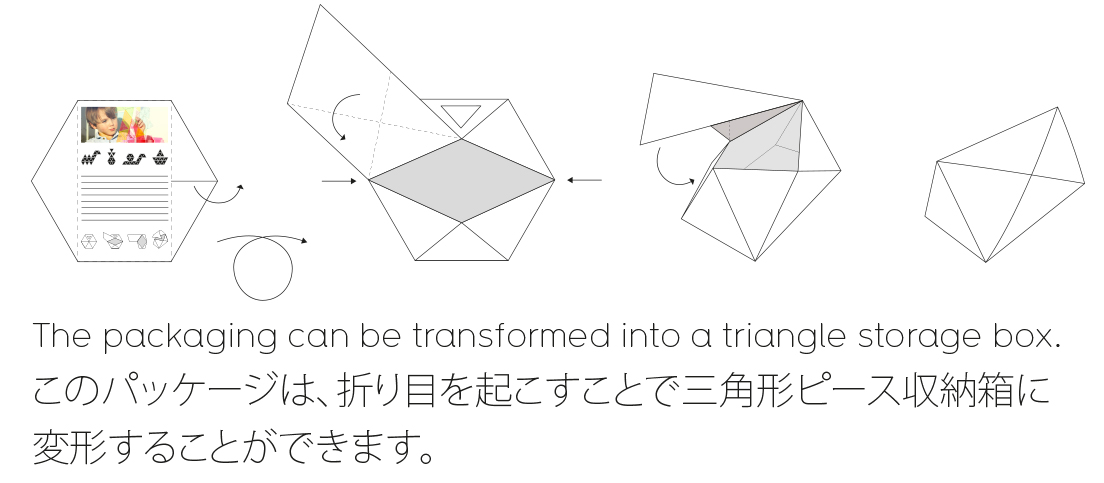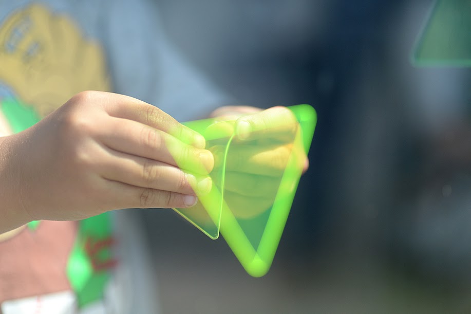 De SAN KAKU MADO bestaat uit transparante driehoekjes waarmee kinderen zelf patronen, beelden en objecten kunnen creëren en herschikken. Een pakje bevat 36 driehoekjes van één kleur en er kan uit vijf verschillende kleuren gekozen worden. Bijzondere van dit product is dat het overal kan worden gespeeld zodra er ramen zijn om het tegen aan te plakken.