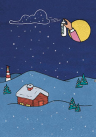 maaktevan mijn mooiste kerstherinnering een prachtige tekening ten behoeve van een decemberzegel. Een Wham huisje maar dan op Ameland waar we kerst 'maakten' met spuitsneeuw.', aldus Moors bij de presentatie.