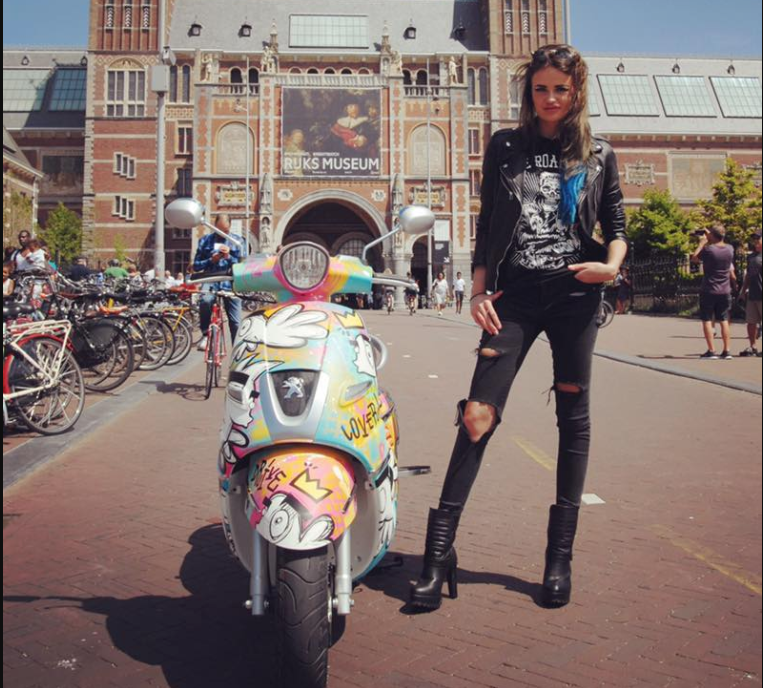 Kunstenares Loes van Delft heeft met haar 26 jaar al een behoorlijke naam weten te maken. In 2012, het jaar dat ze examen deed aan SintLucas in Boxtel, werd ze tijdens de Amsterdam International Art Fair bekroond met de Best Global Artist Award. Sindsdien heeft haar carrière een flinke vlucht genomen en heeft ze over de hele wereld geëxposeerd. In Nederland is ze ook bekend van haar optredens in de real life documentaire ‘Connected’ en het programma ‘Mindf*ck’. Haar bekende muisachtige karaktertje Pjipje komt in bijna al haar werk terug en is haar iconische handelsmerk geworden. Ook op de door haar onder handen genomen Django speelt Pjipje de hoofdrol. Met felgekleurde spuitbusverf en kreten als ‘drive’, ‘king’, ‘rock’ en ‘roll’ heeft ze haar scooter omgetoverd tot wat lijkt op een rijdende graffitipiece.