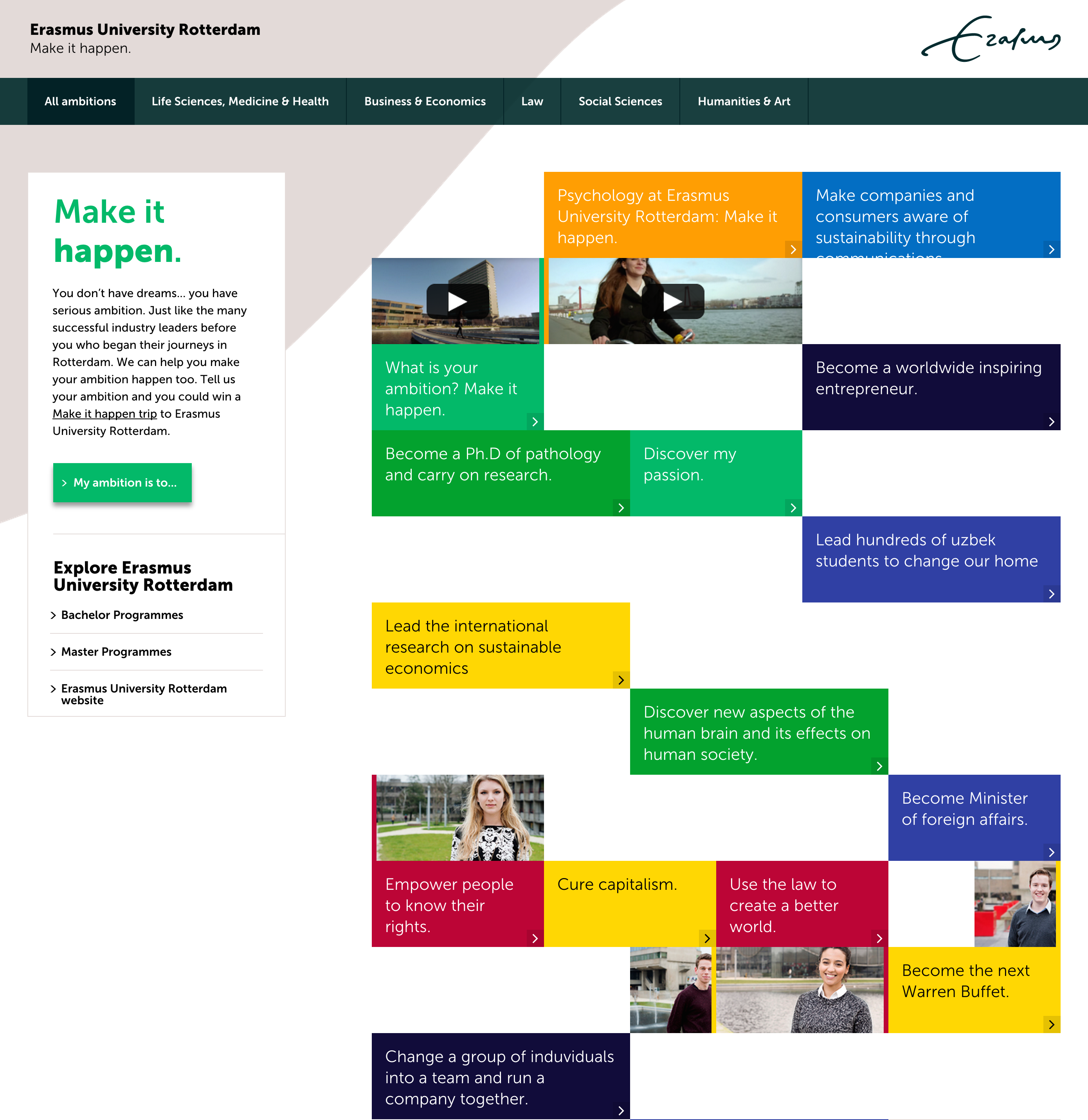 In de campagne worden (potentie¨le) studenten gevraagd om hun ambitie op http://makeithappen.eur.nl vast te leggen. Zo ontstaat een 'Wall of Ambition': een groeiende verzameling van ambities van huidige studenten e´n de ambities die de faculteiten en instituten op dit moment aan het realiseren zijn. Een bron van inspiratie voor potentie¨le studenten en een kennismaking met de mentaliteit die er aan de Erasmus Universiteit heerst. Een aantal van hen die een ambitie vastleggen wordt geselecteerd om naar Rotterdam te komen voor hun eigen Make it happen-trip: verschillende ontmoetingen en activiteiten op basis van hun eigen ambitie.