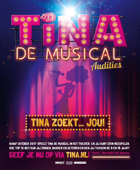 Met deze laatste zin doelt hij op een talentenjacht die wordt opgezet voor deze musical. Voor de rollen van Tina, Puck en Fabio gaat Homemade Productions op zoek naar jongens en meisjes tussen 9 en 18 jaar. Zij kunnen tussen januari en april 2017 auditie doen. Auditanten maken kans om te mogen deelnemen aan de Tina Academy, waar ze opgeleid worden tot musicalster. Opgeven kan tot 10 januari via tina.nl.