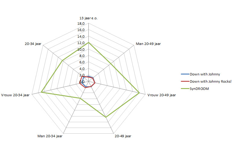 Waar de oude afleveringen niet boven een kijkdichtheid van 4,2% (588.672 gemiddelde aantal kijkers) uit zijn gekomen heeft zijn nieuwe programma “SynDROOM” op RTL4 het nu al verder geschopt en hebben de eerste twee afleveringen een gemiddelde kijkdichtheid van 12% (1.681.920 aantal kijkers) behaald op de doelgroep 13+. De meest selectieve doelgroep is nu vrouw 20- 49. Johnny weet echter niet alleen de vrouwen te boeien: was de gemiddelde kijkdichtheid voor “Down with Johnny” op Veronica op mannen 20-34 maar 2,8% (42.728 aantal kijkers); “SynDROOM” behaalt op deze doelgroep maar liefst een gemiddelde kijkdichtheid van 5,8% (88.508 aantal kijkers).