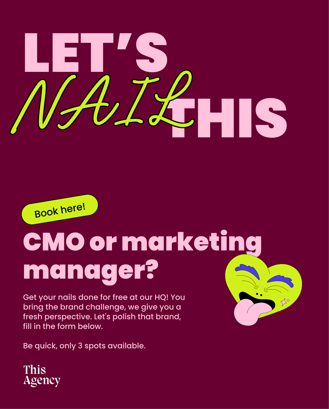 Geen decks, geen salespraat, maar nagellak en merkstrategie. This Agency komt met een opvallende uitnodiging voor CMO’s en marketingmanagers die vastlopen op hun merk: schuif aan voor een sessie op kantoor en vertrek met een frisse blik én verzorgde nagels.