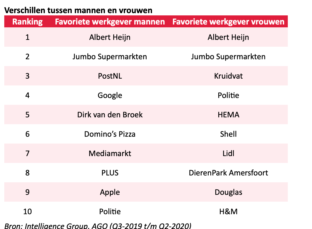 Albert Heijn is onder scholieren en studenten opnieuw gekozen als meest favoriete werkgever voor een bijbaan, gevolgd door Jumbo Supermarkten. Dit blijkt uit het Arbeidsmarkt GedragsOnderzoek (AGO) van Intelligence Group, waarin er aan 2.914 scholieren en studenten werd gevraagd bij welke organisatie zij het liefst een bijbaan zouden willen hebben. Opvallend is dat de top tien dit jaar een aantal nieuwkomers bevat. PostNL, Politie, Lidl en met name Domino’s Pizza zijn dit jaar een stuk populairder geworden onder scholieren en studenten.