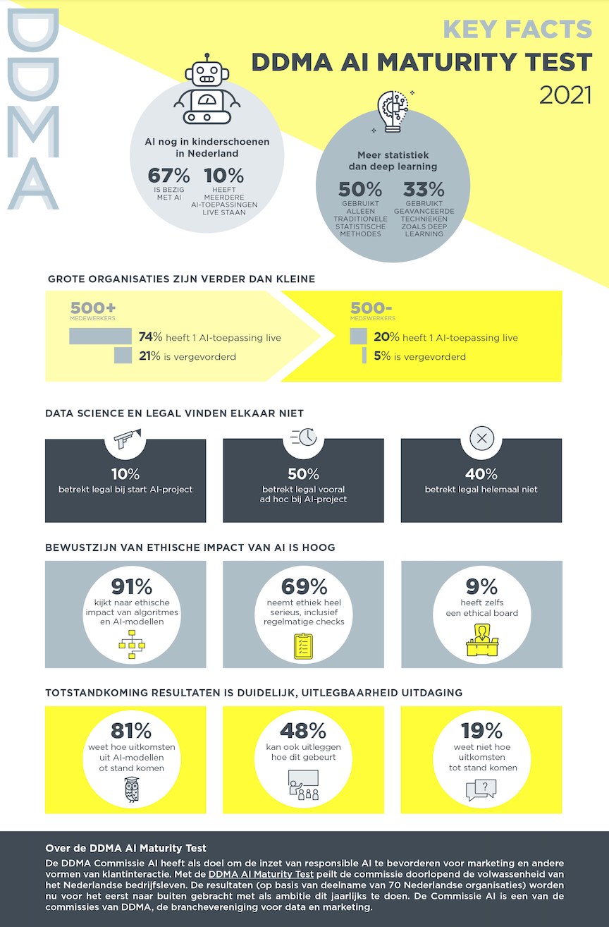 De DDMA Commissie AI heeft als doel om de inzet van responsible AI te bevorderen voor marketing en andere vormen van klantinteractie. Met de DDMA AI Maturity Test peilt de commissie doorlopend de volwassenheid van het Nederlandse bedrijfsleven. De resultaten worden nu voor het eerst naar buiten gebracht, met als ambitie dit jaarlijks te doen. De Commissie AI is een van de commissies van DDMA, de branchevereniging voor data en marketing.