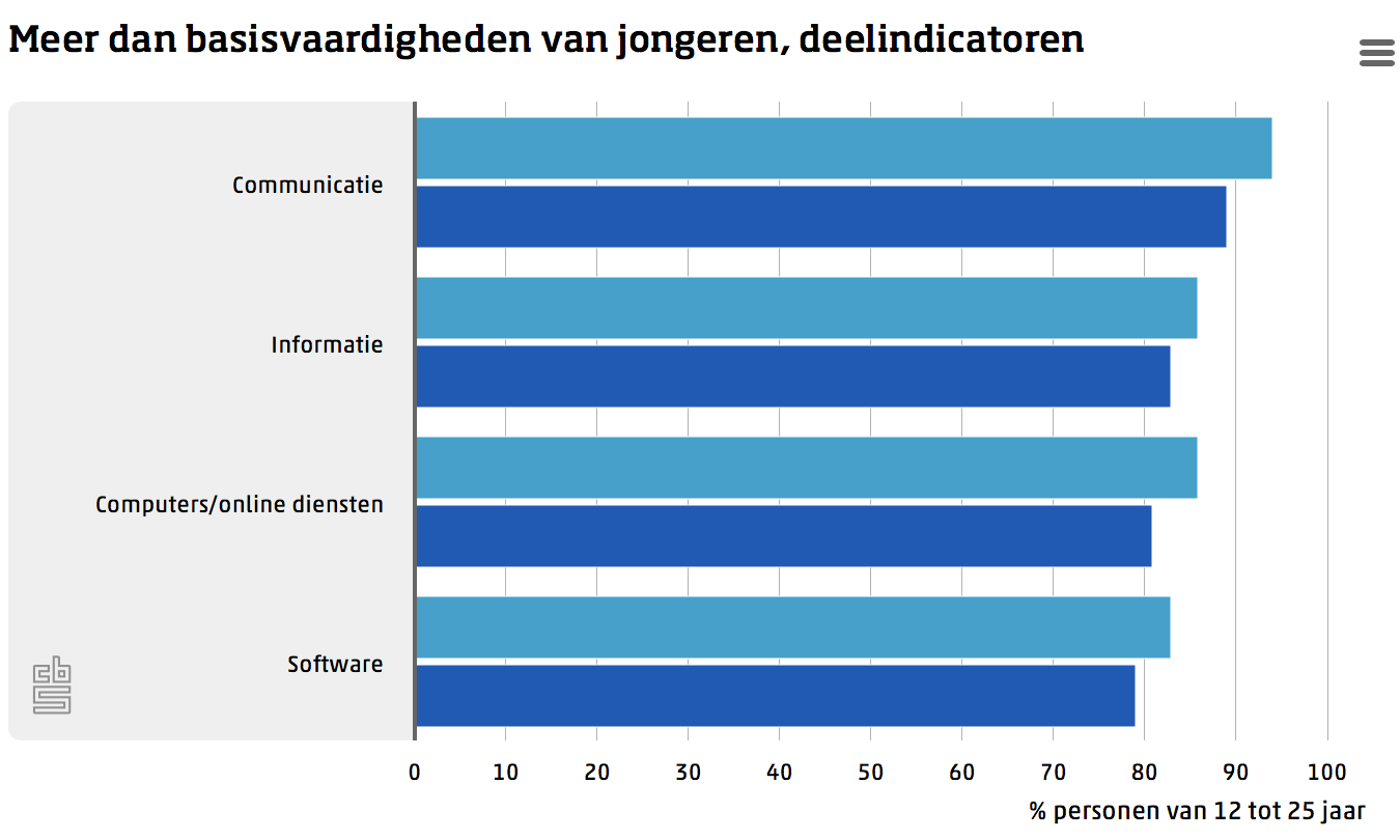 Maar liefst 96 procent van de Nederlandse jongeren tussen de 12 en 25 jaar is vrijwel elke dag online. In 2015 was dit nog 93 procent. In dezelfde periode zijn jongeren ook vaardiger geworden in het gebruik van internet, computers en software. 72 procent van de jongeren had in 2019 meer dan basisvaardigheden, in 2015 was dat 63 procent. In 2019 had 41 procent van de 25-plussers in Nederland meer dan digitale basisvaardigheden, in 2015 was dat 34 procent.