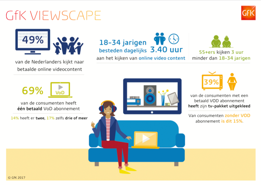 GfK ViewScape, een internationale studie, maakt de videoconsumptie van Nederlanders inzichtelijk. Bijna de helft van de Nederlanders boven de 18 kijkt inmiddels naar betaalde online videocontent.